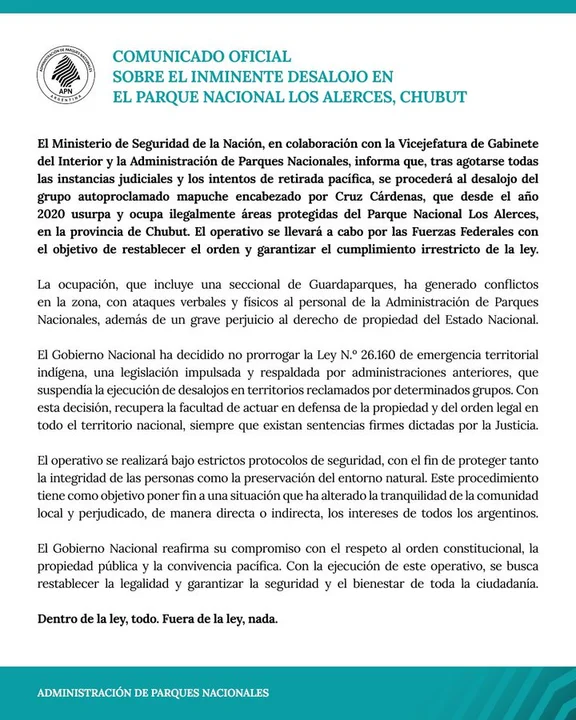 Según precisa el comunicado, el operativo se llevará adelante por las fuerzas federales con el objetivo de restablecer el orden y garantizar el cumplimiento irrestricto de la ley. El comunicado detalla que la ocupación incluye una seccional de Guardaparques y ha generado conflictos en la zona, con ataques verbales y físicos al personal de la Administración de Parques Nacionales, además de un grave perjuicio al derecho de propiedad del Estado Nacional.