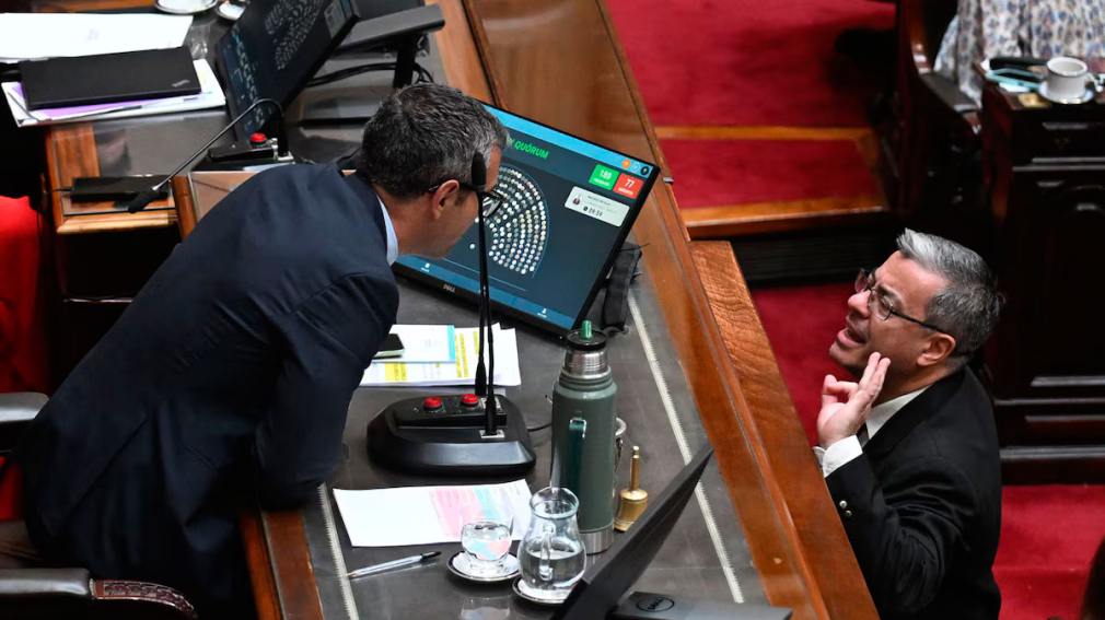 En plena intervención, Martínez aceptó una interrupción y le concedió la palabra al diputado del Frente de Izquierda Nicolás del Caño. Al término, dispuesto a retomar su discurso, Menem rechazó la posibilidad, lo que generó la rápida respuesta del jefe de la bancada.