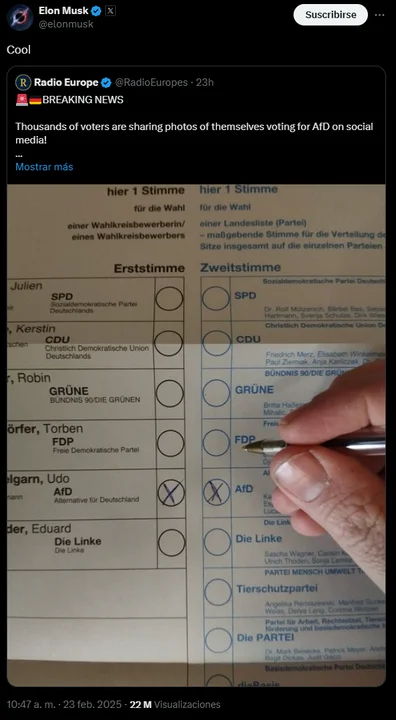 Este domingo, Musk volvió a generar controversia al compartir en sus redes sociales la imagen de una boleta electoral alemana marcada en favor de AfD, acompañada por el comentario «cool» («genial»).