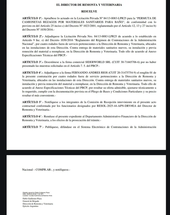 El expediente EX-2025-05393930-APN-DRV#EA, bajo la Licitación Privada Nº 84/13-0083-LPR25, establece la permuta de los vehículos por insumos sanitarios, debido a la falta de fondos para realizar la obra de mantenimiento. De acuerdo al documento oficial, las camionetas «ya no son de utilidad» y la transacción se justifica para «detener el deterioro de las instalaciones».