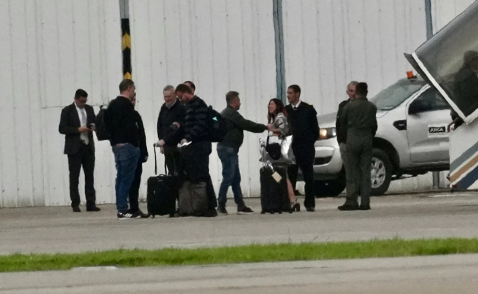 Una fotografíatomada este domingo 27 de abril por la mañana en el Aeroparque Jorge Newbery puede observarse no solo a los principales funcionarios del gobierno de Javier Milei, sino además a Macarena Jimena Rodríguez, conocida como la funcionaria digital y que el candidato a legislador, Manuel Adorni, negó que sea su CM.