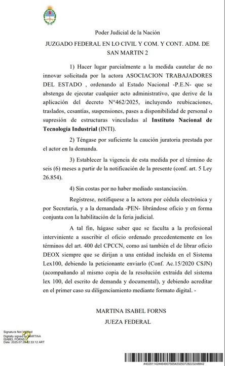 La jueza resolvió “hacer lugar parcialmente a la medida cautelar de no innovar solicitada por la actora Asociación Trabajadores del Estado, incluyendo reubicaciones, traslados, cesantías, suspensiones, pases a disponibilidad de personal o supresión de estructuras vinculadas al Instituto Nacional de Tecnología Industrial”.