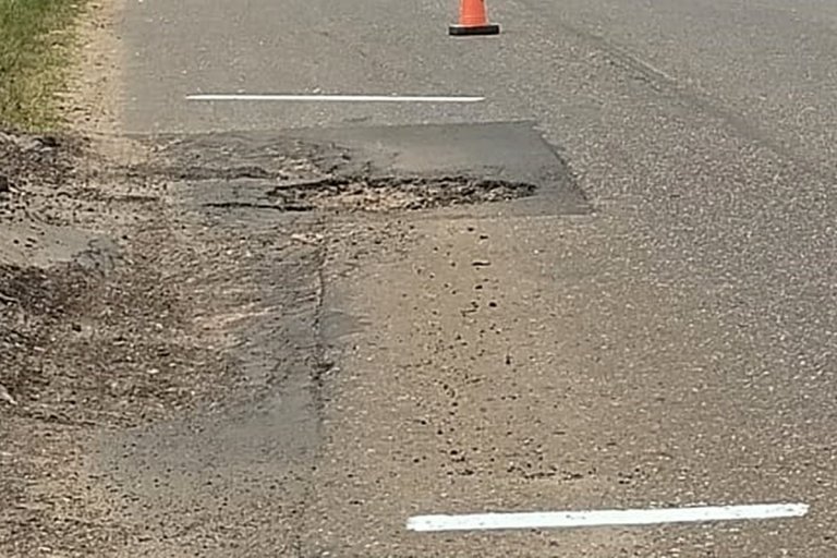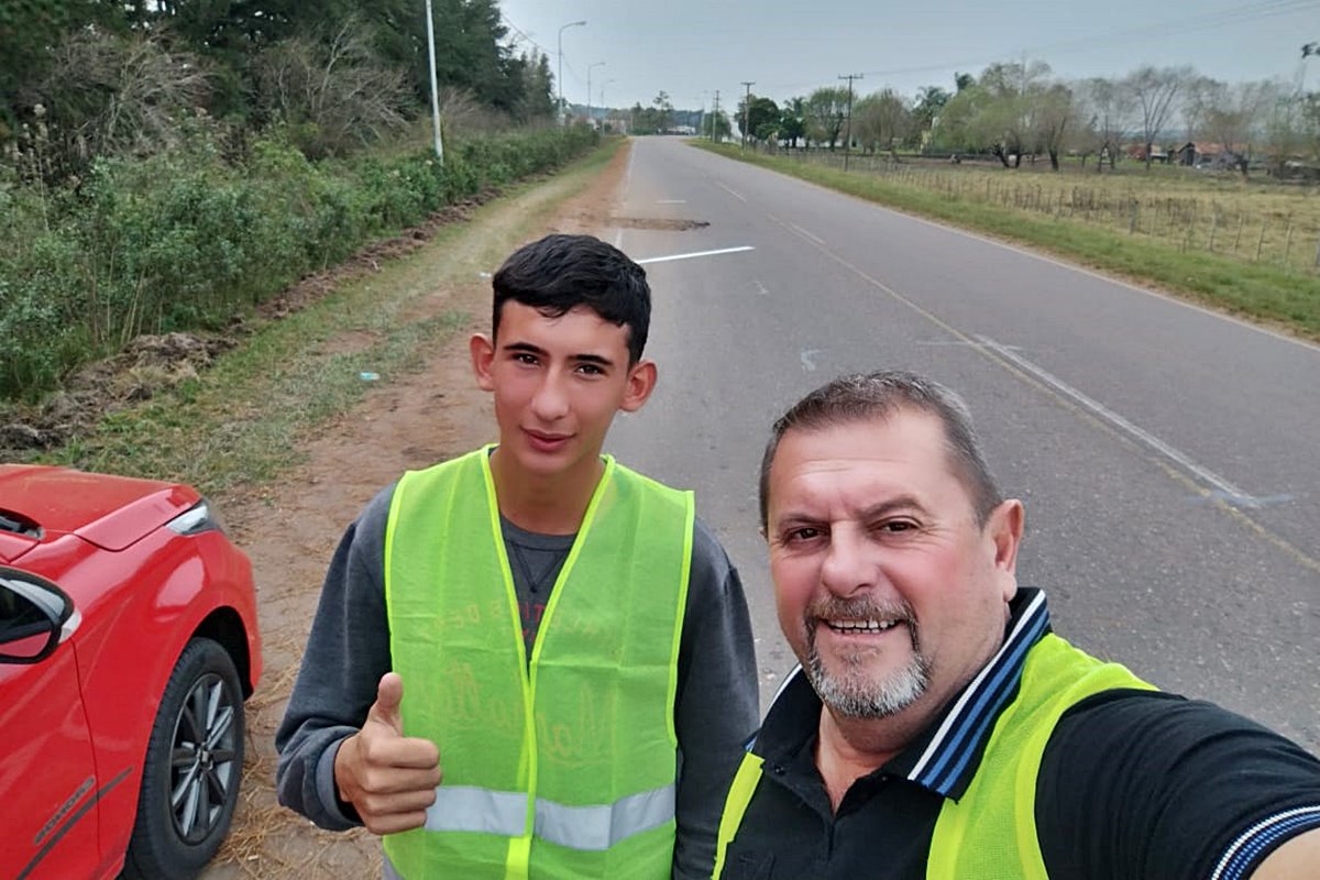 Por su propia cuenta y haciendo una colecta, señalizaron junto a su hijo, con pintura algunos baches de la Ruta 4, entre Los Charrúas y la Ruta 14.