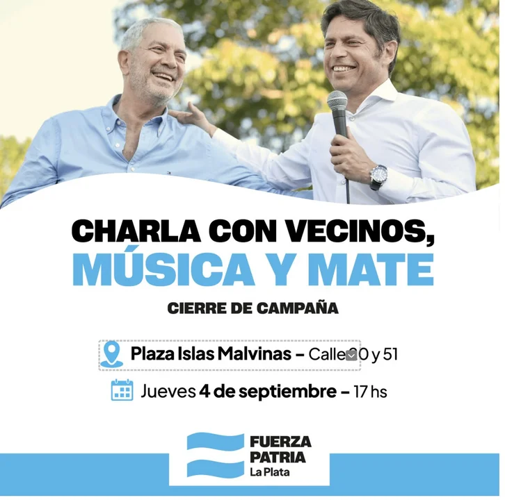 El gobernador bonaerense, Axel Kicillof, cerrará mañana la campaña de Fuerza Patria con visitas a Merlo y Lomas de Zamora, por la tarde retomará una vieja estrategia proselitista al encabezar una charla y “mateada” con vecinos en La Plata.