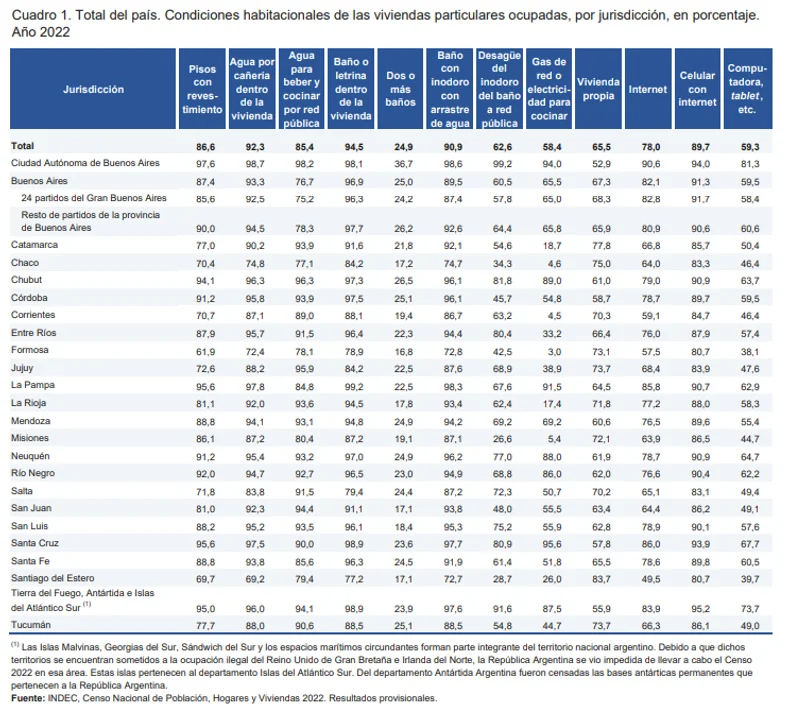 La tabla de «Condiciones habitacionales» del Censo Nacional de Población, Hogares y Viviendas 2022, publicado por el INDEC, precisa la situación en la provincia:
