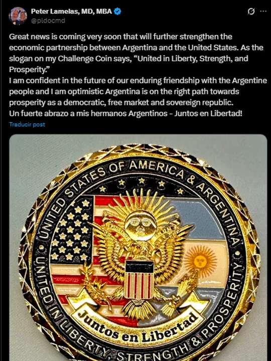 «Pronto tendremos grandes noticias que fortalecerán aún más la alianza económica entre Argentina y Estados Unidos. Como dice el lema de mi Moneda de Desafío: ‘Unidos en Libertad, Fuerza y Prosperidad'», señaló a través de un mensaje que difundió por su cuenta de la red social X.