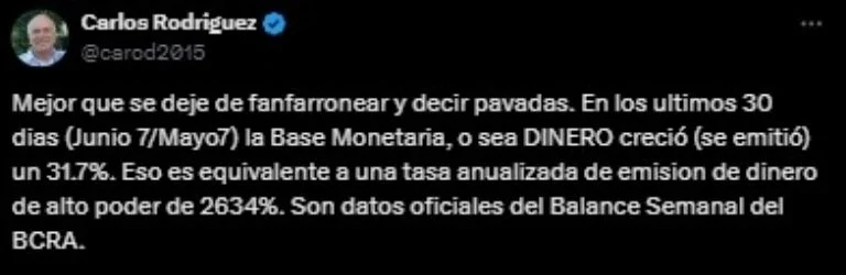 «Mejor que se deje de fanfarronear y decir pavadas. En los últimos 30 días (Junio 7/Mayo7) la Base Monetaria, o sea DINERO creció (se emitió) un 31.7%. Eso es equivalente a una tasa anualizada de emisión de dinero de alto poder de 2634%. Son datos oficiales del Balance Semanal del BCRA», fue otro de los fuertes mensajes que compartió.