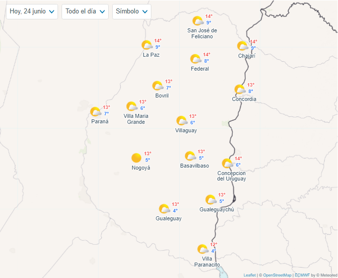 A partir de la jornada de hoy el centro de la Argentina presentará condiciones estables y sin pronóstico de precipitaciones. En Entre Ríos estará mayormente soleado, pese a lo cual la temperatura no llegaría a los 15 grados.