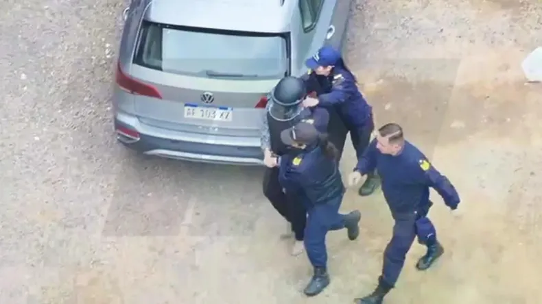 María Victoria Caillava está siendo indagada por la desaparición de Loan Danilo Peña, del mismo modo que se hará con su marido, Carlos Pérez, y el comisario Maciel. La mujer llegó esposada, con casco y con chaleco antibalas.