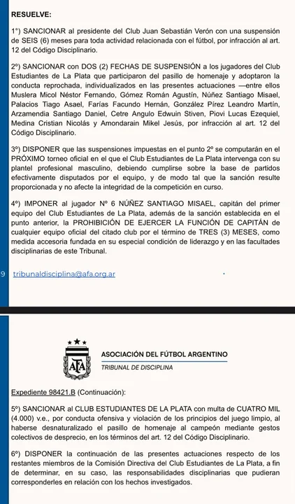 Por último, el Tribunal dispuso continuar las actuaciones sobre otros integrantes de la Comisión Directiva de Estudiantes, con el fin de determinar si corresponden nuevas sanciones por los hechos investigados.