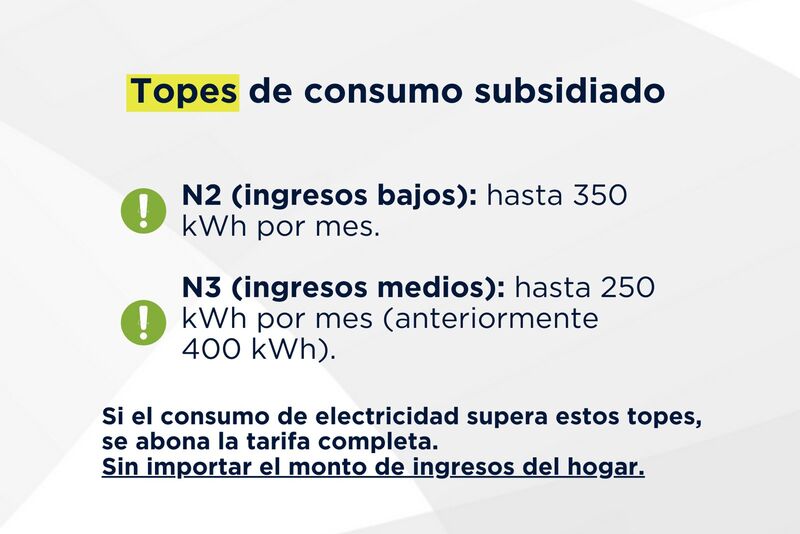 N3: Ingresos familiares entre 773.385 pesos y 2.706.848 pesos. Solo se subsidia 250 kWh por mes. Antes era de 400 kWh.