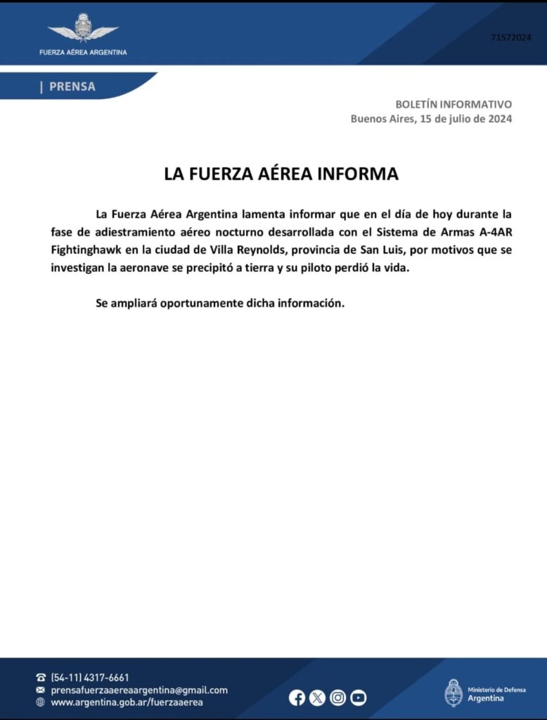 El comunicado completo explicó: «La Fuerza Aérea Argentina lamenta informar que en día de hoy durante la fase de adiestramiento aéreo nocturno desarrollada con el Sistema de Armas A-4AR Fightinghawk en la ciudad de Villa Reynolds, provincia de San Luis, por motivos que se investigan la aeronave se precipitó a tierra y su piloto perdió la vida».