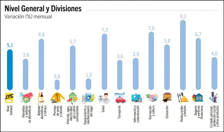 Servicios reflejó principalmente las alzas en los valores de los gastos comunes de la vivienda, en los precios de los restaurantes, bares y casas de comida y en las tarifas del alojamiento en hoteles por motivos turísticos. En menor medida, se destacaron las actualizaciones en las cuotas de la medicina prepaga y en los valores de los alquileres.