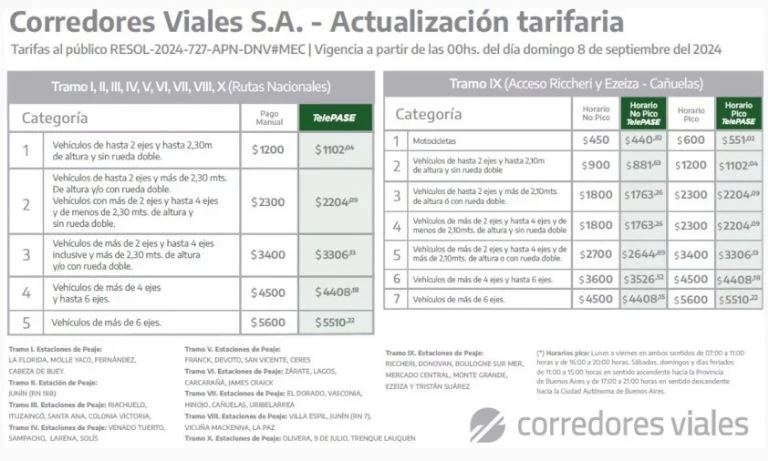 De este modo quedan establecidas las nuevas tarifas en las estaciones de peaje de los tramos I al X de la red vial nacional, incluyendo el Acceso Riccheri, concesionados a la empresa Corredores Viales S.A.