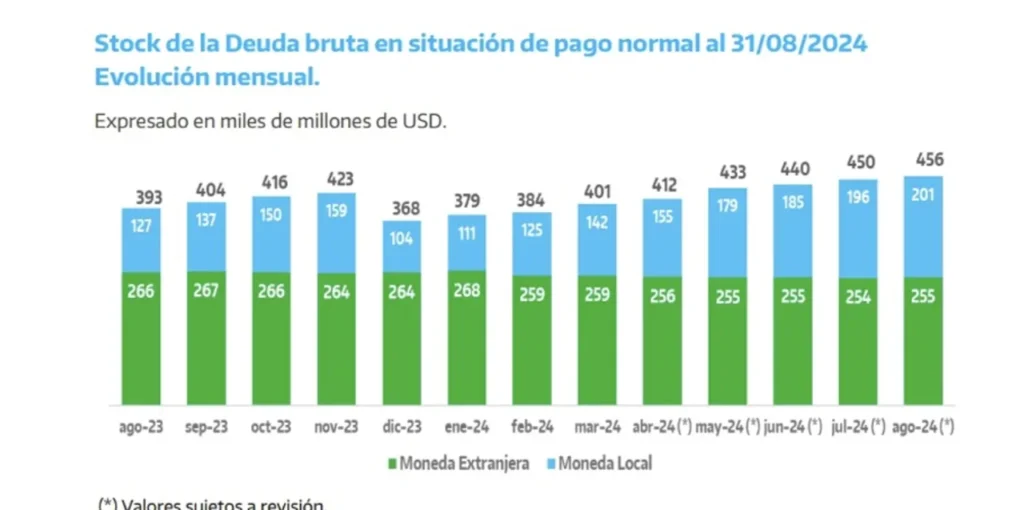 La deuda en situación de pago normal subió a la cifra record de US$ 455.935 millones en agosto, lo que representó un aumento de US$ 6.318 millones respecto a julio, así lo informó la secretaría de Finanzas.