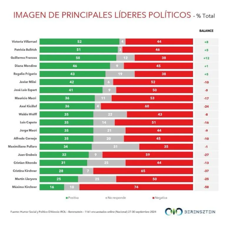 De los 20 dirigentes que fueron auscultados, sólo 5 quedaron con saldo favorable de imagen. Se trata de Villarruel quien registró 52% de positiva, 44% de negativa (+8) y 4% de desconocimiento. La siguen Patricia Bullrich (51/46/+5); el jefe de Gabinete Guillermo Francos (50/38/+12); la Canciller Diana Mondino (46/45/+1) y Frigerio (43/38/+5).